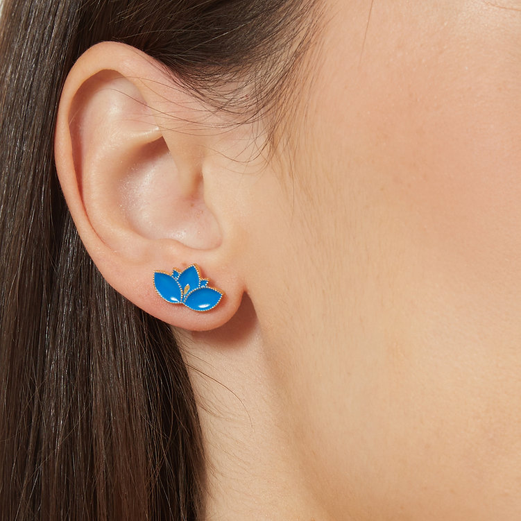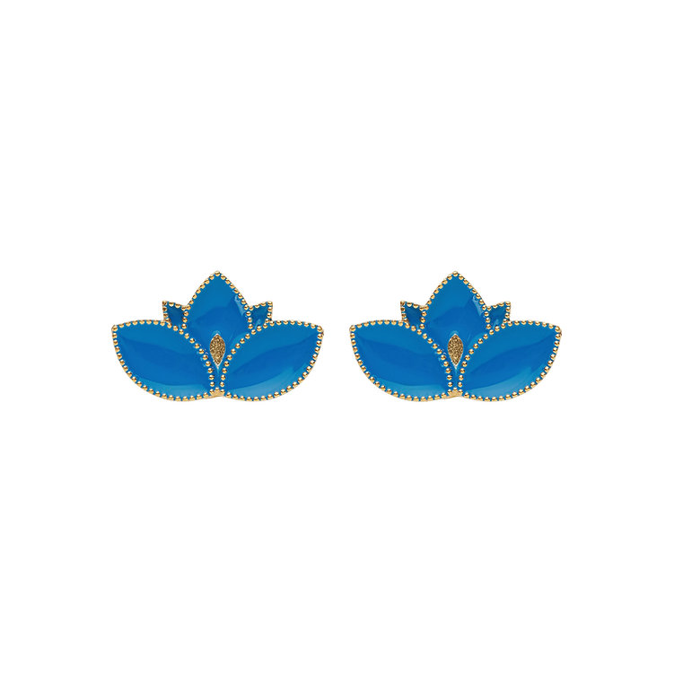 Handmade Lotus earrings crafted from 925 gold-plated silver with blue enamel.