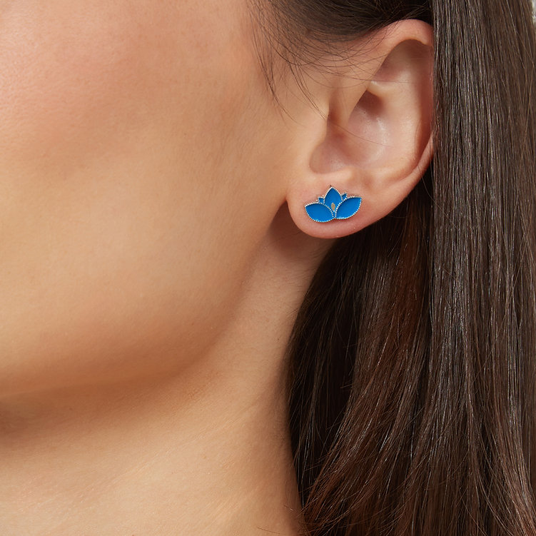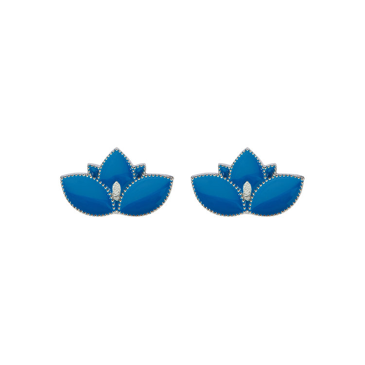 Handmade Lotus earrings crafted from 925 platinum-plated silver with blue enamel.